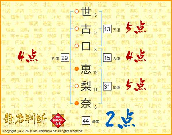 世(5画)古(5画)口(3画) 恵(12画)梨(11画)奈(8画)