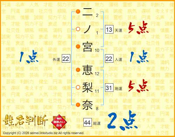 二ノ宮恵梨奈さんの天運は13画の5点!