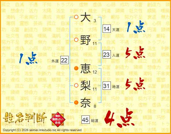 大(3画)野(11画) 恵(12画)梨(11画)奈(8画)