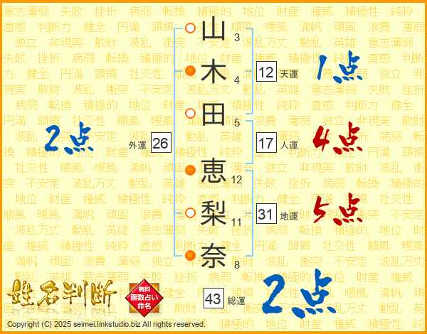 山(3画)木(4画)田(5画) 恵(12画)梨(11画)奈(8画)