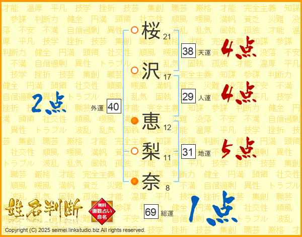 桜(21画)沢(17画) 恵(12画)梨(11画)奈(8画)