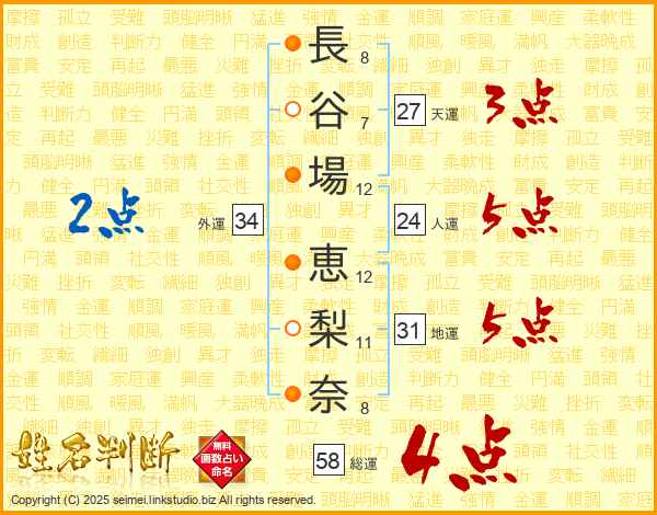 長(8画)谷(7画)場(12画) 恵(12画)梨(11画)奈(8画)