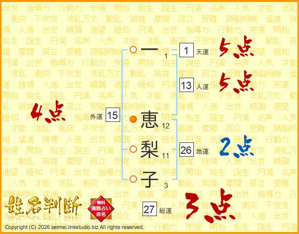 あなたの人生を表す1番重要な運勢です。生涯を通じて影響する総合運となり、主に50歳以降の晩年期に影響を及ぼします。苗字と名前の合計画数。