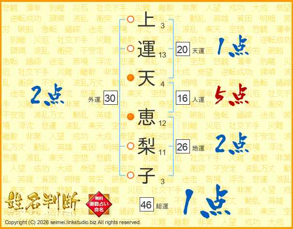 上(3画)運(13画)天(4画) 恵(12画)梨(11画)子(3画)