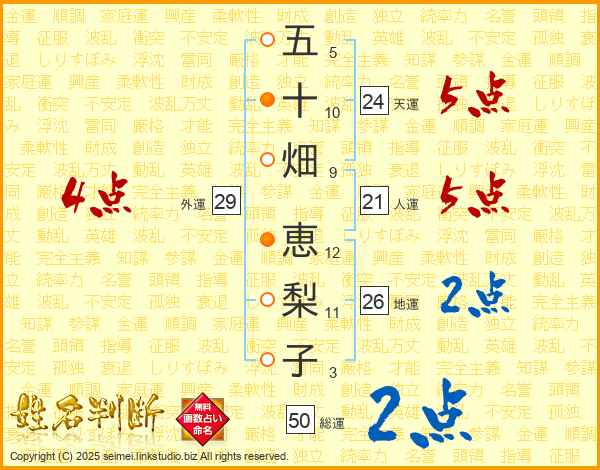 五十畑恵梨子さんの総運は50画の2点!