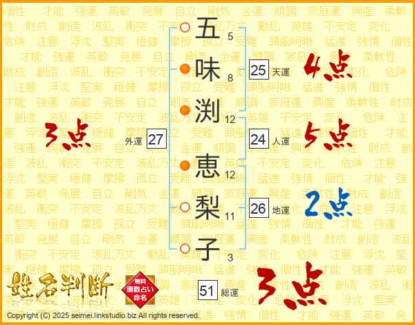 五(5画)味(8画)渕(12画) 恵(12画)梨(11画)子(3画)