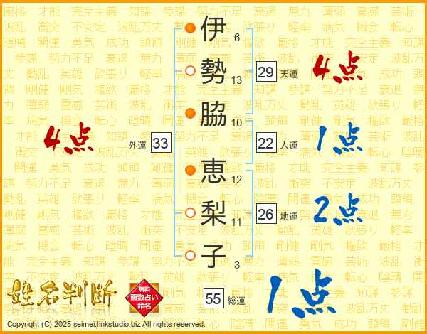 伊(6画)勢(13画)脇(10画) 恵(12画)梨(11画)子(3画)