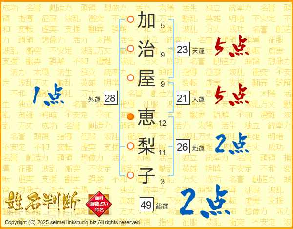 加(5画)治(9画)屋(9画) 恵(12画)梨(11画)子(3画)