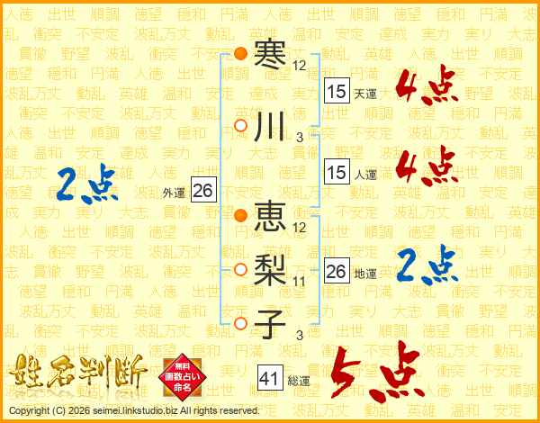 寒(12画)川(3画) 恵(12画)梨(11画)子(3画)