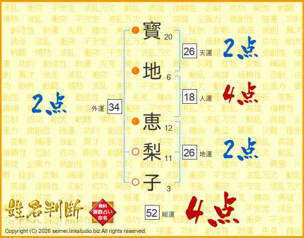 寳(20画)地(6画) 恵(12画)梨(11画)子(3画)