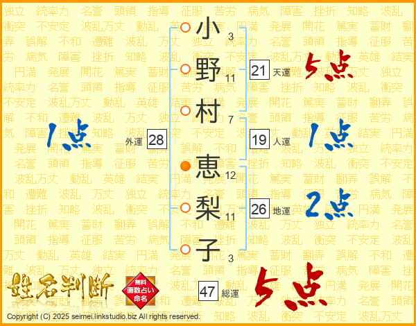 小野村恵梨子さんの総運は47画の5点!