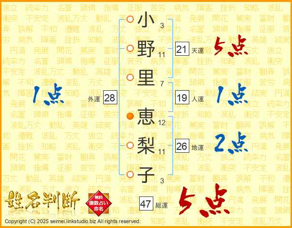 小(3画)野(11画)里(7画)  恵(12画)梨(11画)子(3画)