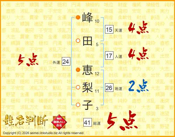 峰(10画)田(5画) 恵(12画)梨(11画)子(3画)