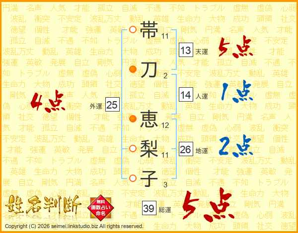 帯刀恵梨子さんの総運は39画の5点!
