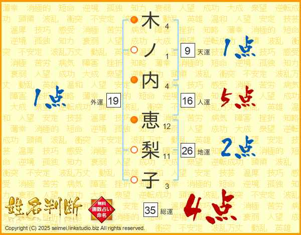 木(4画)ノ(1画)内(4画) 恵(12画)梨(11画)子(3画)