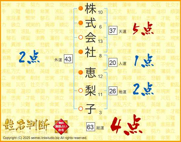 株(10画)式(6画)会(13画)社(8画) 恵(12画)梨(11画)子(3画)