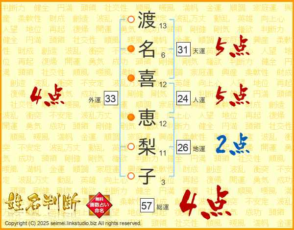 渡(13画)名(6画)喜(12画) 恵(12画)梨(11画)子(3画)