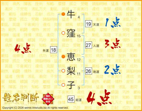 牛(4画)窪(15画) 恵(12画)梨(11画)子(3画)