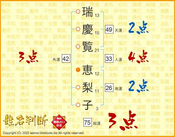 瑞(13画)慶(15画)覧(21画) 恵(12画)梨(11画)子(3画)