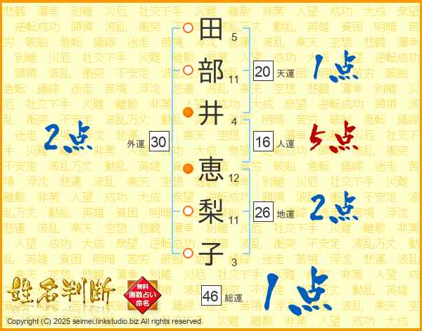 田(5画)部(11画)井(4画) 恵(12画)梨(11画)子(3画)