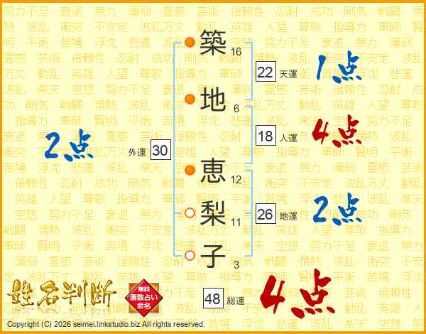 築(16画)地(6画) 恵(12画)梨(11画)子(3画)