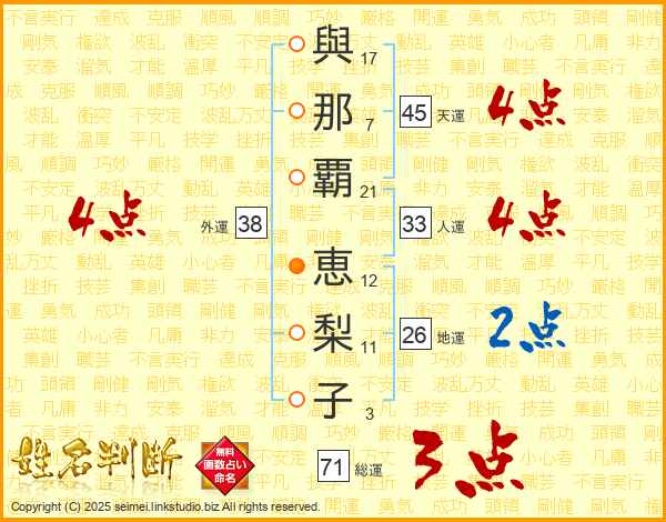 與(17画)那(7画)覇(21画) 恵(12画)梨(11画)子(3画)