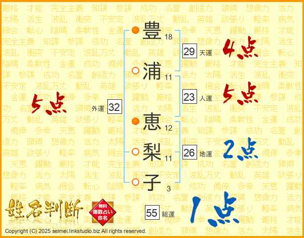 豊(18画)浦(11画) 恵(12画)梨(11画)子(3画)