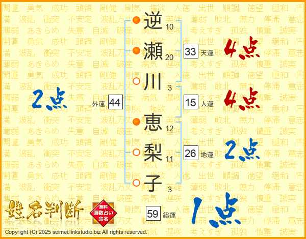 逆(10画)瀬(20画)川(3画) 恵(12画)梨(11画)子(3画)