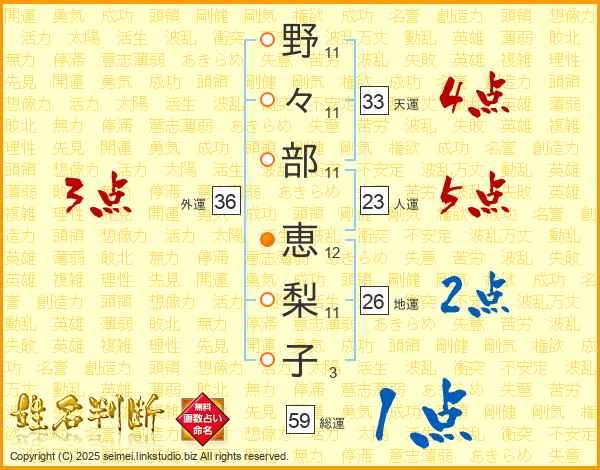 野(11画)々(11画)部(11画) 恵(12画)梨(11画)子(3画)
