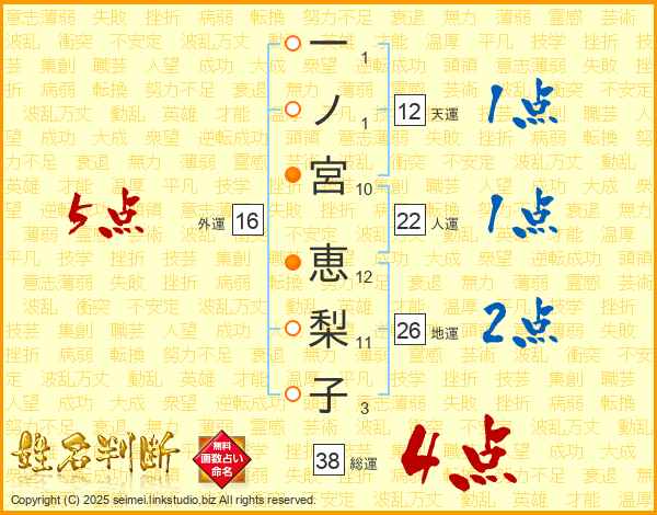 一(1画)ノ(1画)宮(10画) 恵(12画)梨(11画)子(3画)