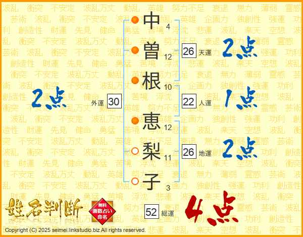 中(4画)曽(12画)根(10画) 恵(12画)梨(11画)子(3画)