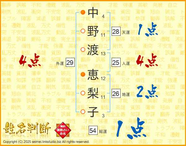 中(4画)野(11画)渡(13画) 恵(12画)梨(11画)子(3画)