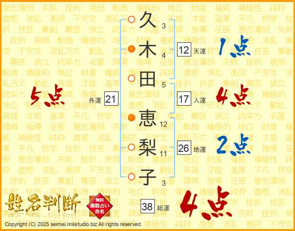 久(3画)木(4画)田(5画) 恵(12画)梨(11画)子(3画)