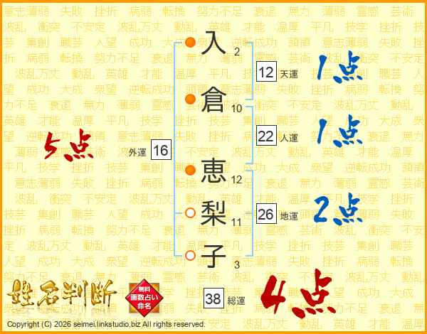 入(2画)倉(10画) 恵(12画)梨(11画)子(3画)