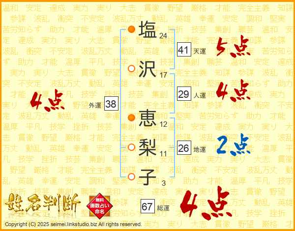 塩(24画)沢(17画) 恵(12画)梨(11画)子(3画)