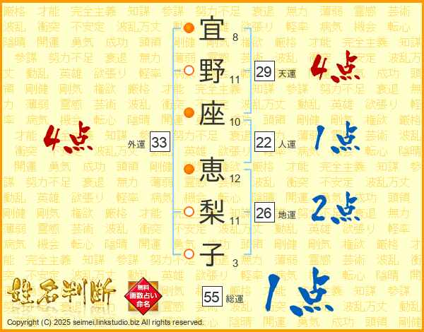 宜(8画)野(11画)座(10画) 恵(12画)梨(11画)子(3画)