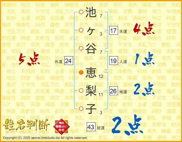 池ヶ谷恵梨子さんの総運は43画の2点!