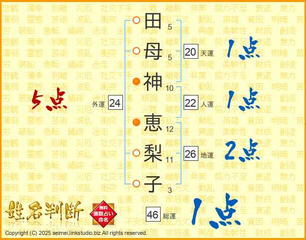 田(5画)母(5画)神(10画) 恵(12画)梨(11画)子(3画)