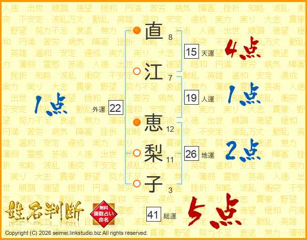 直(8画)江(7画) 恵(12画)梨(11画)子(3画)