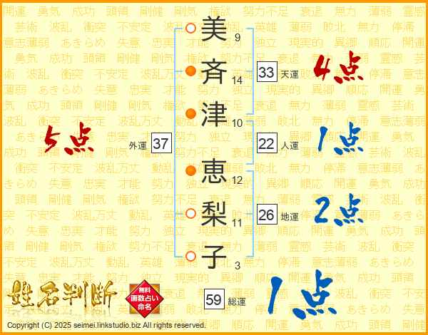 美(9画)斉(14画)津(10画) 恵(12画)梨(11画)子(3画)