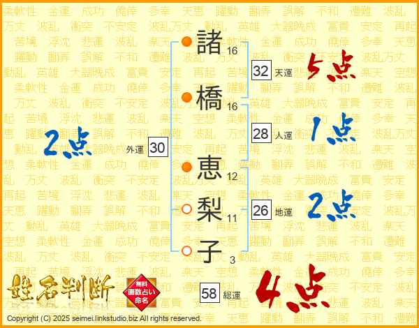 諸(16画)橋(16画) 恵(12画)梨(11画)子(3画)