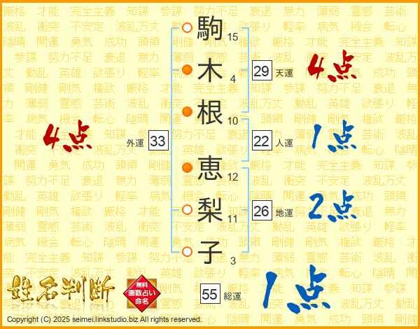 駒(15画)木(4画)根(10画) 恵(12画)梨(11画)子(3画)