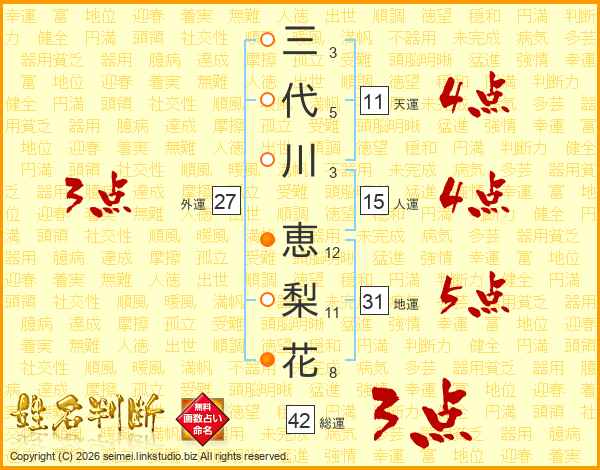 三(3画)代(5画)川(3画) 恵(12画)梨(11画)花(8画)