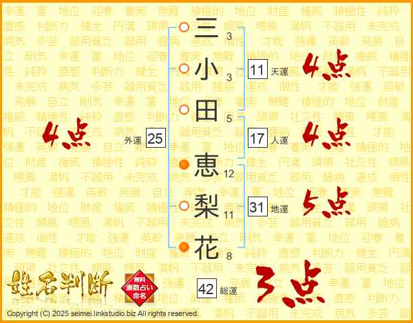 三(3画)小(3画)田(5画) 恵(12画)梨(11画)花(8画)