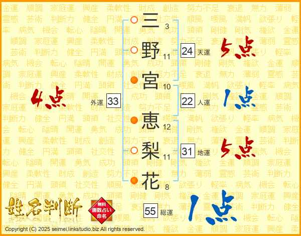 三(3画)野(11画)宮(10画) 恵(12画)梨(11画)花(8画)