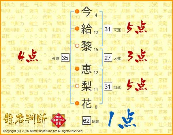 今(4画)給(12画)黎(15画) 恵(12画)梨(11画)花(8画)