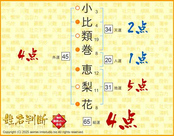 小(3画)比(4画)類(19画)巻(8画) 恵(12画)梨(11画)花(8画)