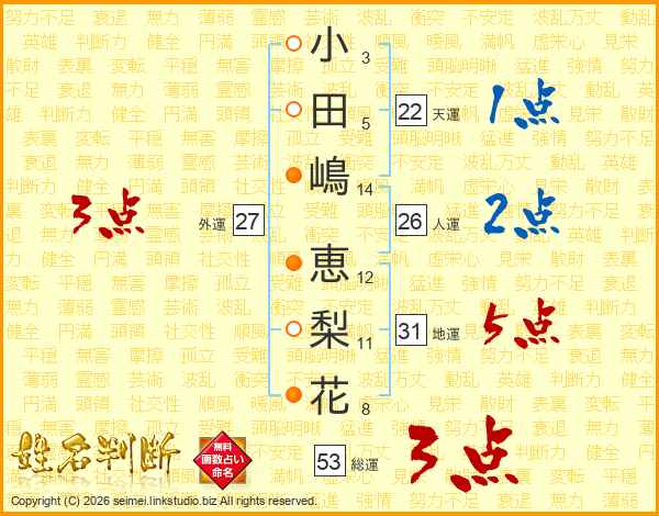 小田嶋恵梨花さんの総運は53画の3点!