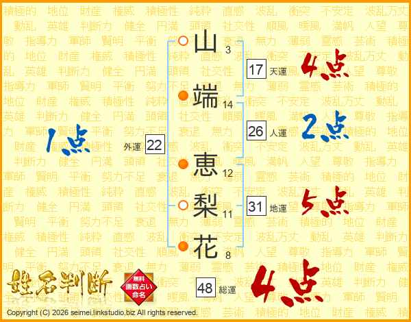 山(3画)端(14画) 恵(12画)梨(11画)花(8画)