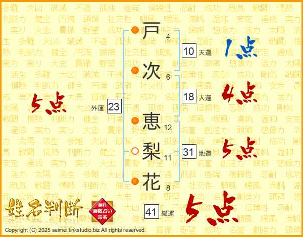 戸(4画)次(6画) 恵(12画)梨(11画)花(8画)